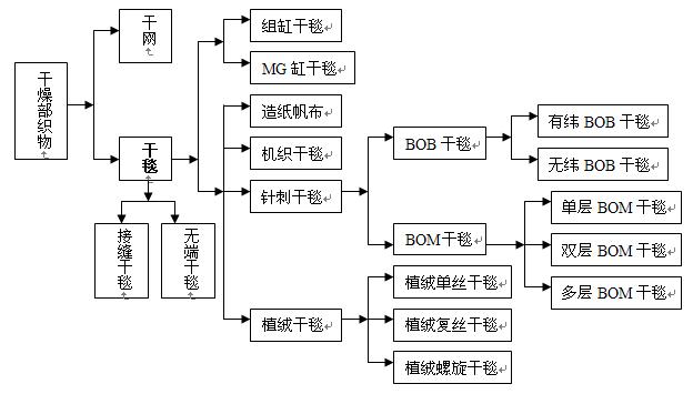 根據(jù)制造干毯使用原料和結(jié)構(gòu)狀況劃分,可分為帆布干毯、機(jī)織干毯、針刺干毯和植絨干毯(網(wǎng))等。