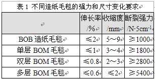 表1列出了不同品種的造紙毛毯,其尺寸變化要求和斷裂強(qiáng)力要求。