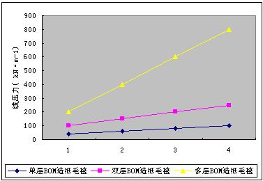 圖1所示不同底網(wǎng)層數(shù)的造紙毛毯所能承受線壓力的曲線圖。