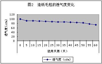 圖2為1200g?m-2雙層壓榨毛毯在車(chē)速為400m?min-1的造紙機(jī)上使用時(shí)的透氣度變化情況,供參考。