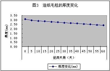 圖3列出1200 g?m-2雙層壓榨毛毯在400 m?min-1造紙機(jī)上使用過(guò)程中的厚度變化。