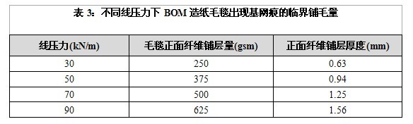 表3說明了在不同的線壓力下BOM造紙毛毯正面的臨界鋪毛量的關(guān)系。