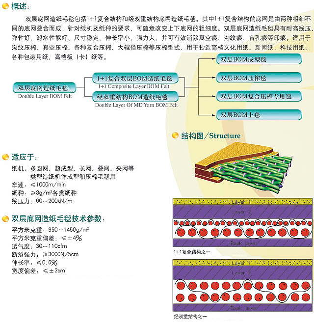4 | 47505 | 1100-1400 | 雙層底網(wǎng)、國產(chǎn)原料 | 作復(fù)合壓榨、真空盲孔壓榨、大輥徑壓榨毯生產(chǎn)文化、包裝用紙等 | 減輕印痕、耐高線壓、壽命長 |